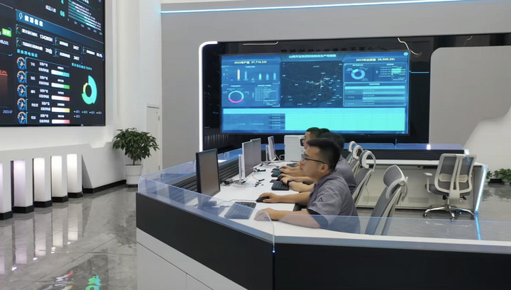工作人员正在数字云工厂运营中心内远程确认法兰锻造设备运行状态。新华社记者张哲 摄
