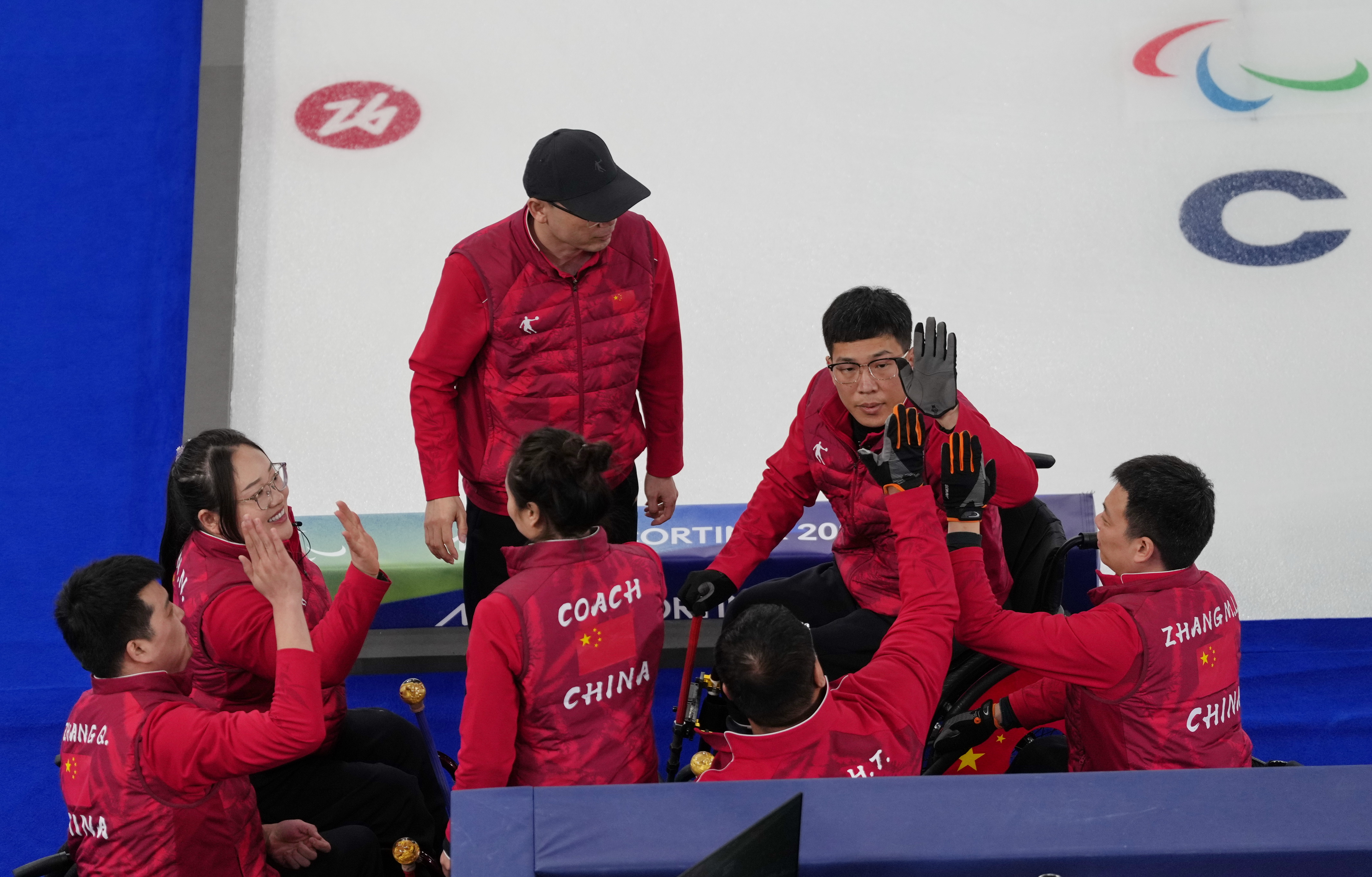 3月14日,中国队选手和教练员在比赛间隙击掌鼓劲。新华社记者 牟宇 摄