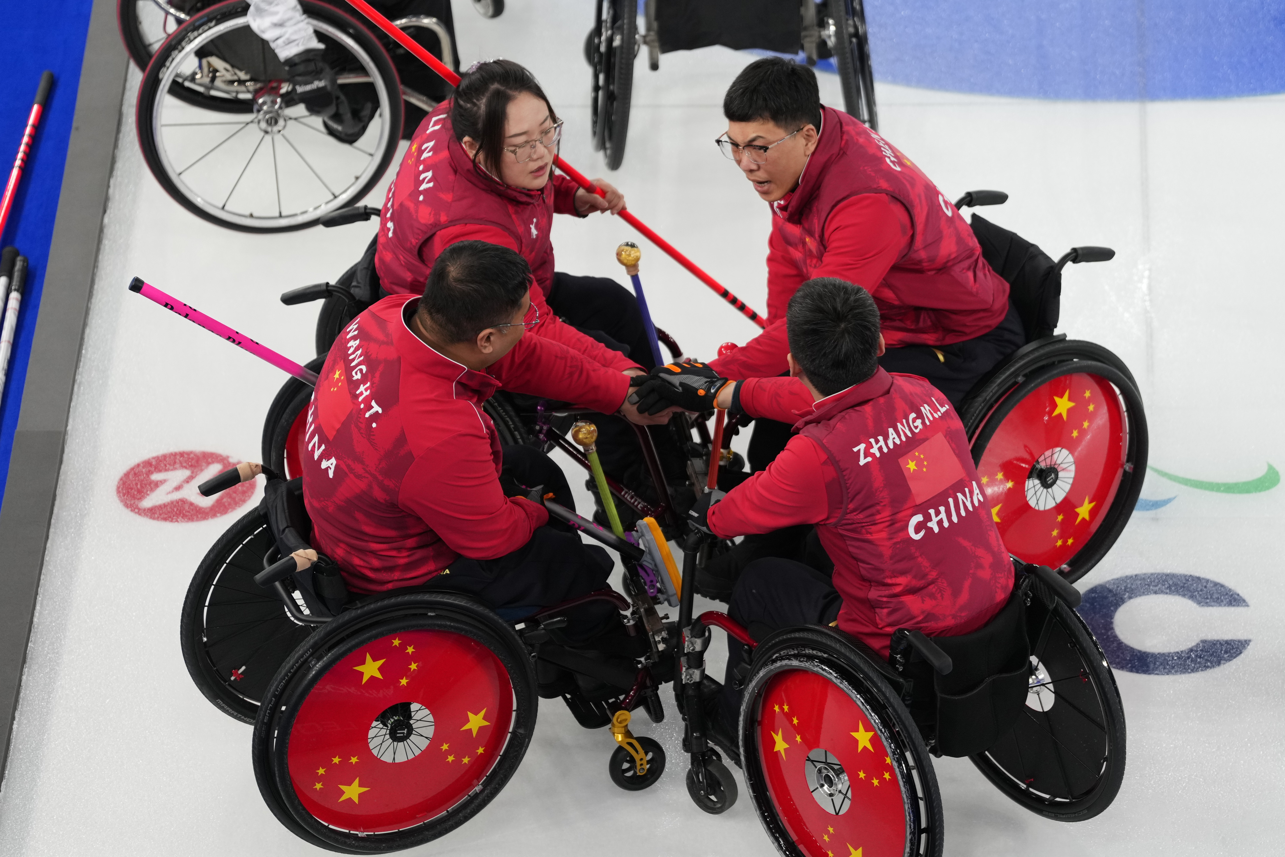 3月14日,中国队选手李娜娜(左上)、陈建新(右上)、王海涛(左下)和张明亮在比赛间隙加油鼓劲。新华社记者 牟宇 摄