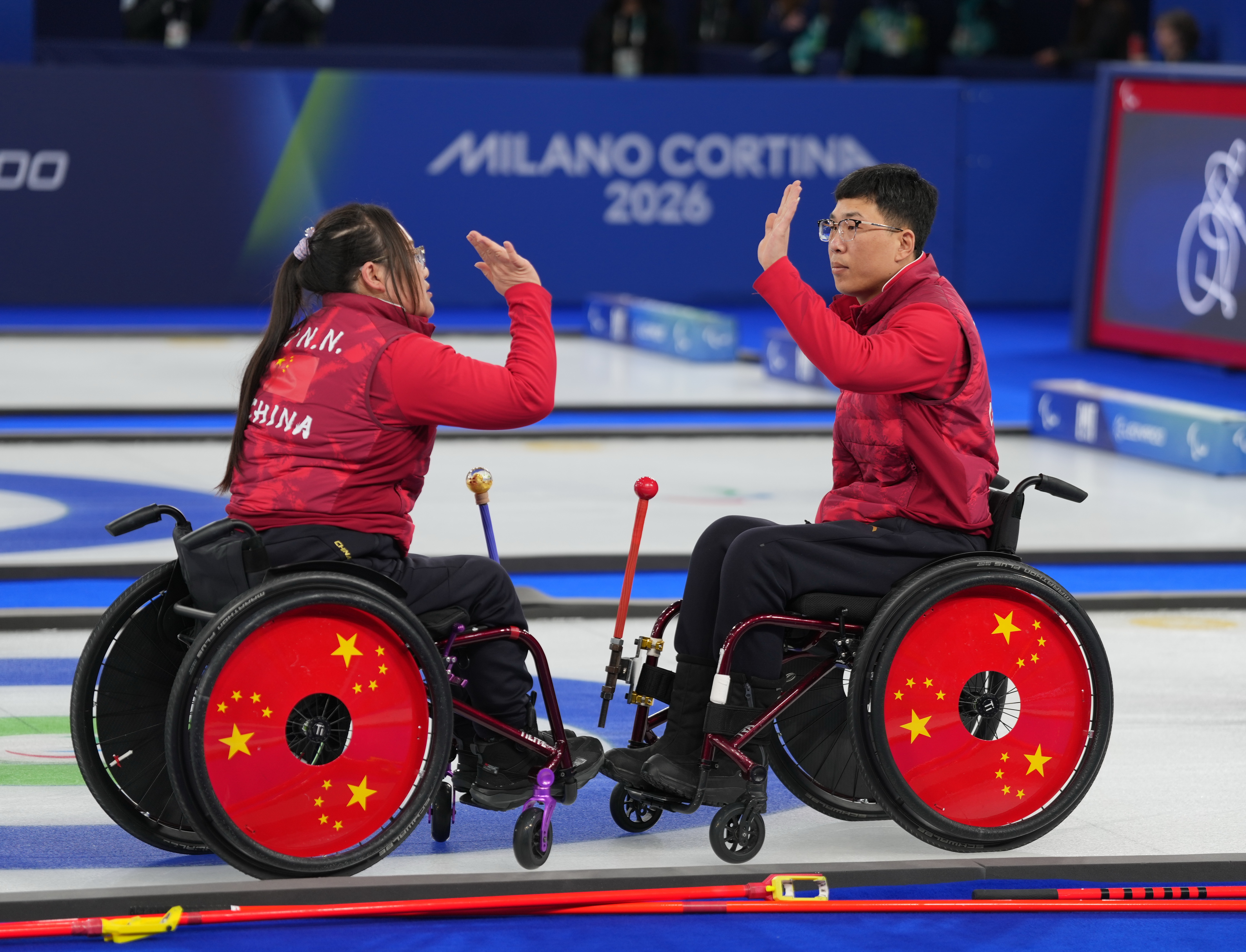 3月14日,中国队选手李娜娜(左)和陈建新在比赛中击掌鼓劲。新华社记者 牟宇 摄