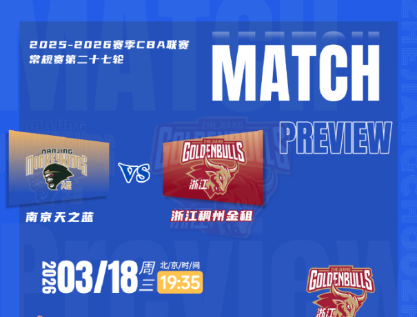 虎扑03月18日讯 今日CBA常规赛:浙江男篮将对阵南京男篮。